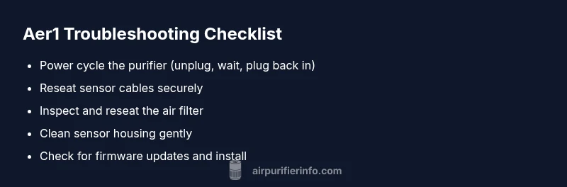 According to Air Purifier Info, aer1 is a diagnostic error code that signals a sensor or communication fault within your air purifier. It commonly appears when the device cannot read current air quality reliably, which can cause false readings or unexpected shutdowns. In many cases, a simple reboot or reseating internal connectors resolves the issue quickly; however, persistence may require deeper checks and potential professional assistance. The goal is to restore accurate air-quality data and normal operation, so you can protect your home's dust, odors, and allergen control. Throughout this article, aer1 will refer to the error code you see on your purifier’s display, and we’ll use practical steps homeowners and renters can follow. Air Purifier Info’s analysis shows that most aer1 incidents stem from sensor connection issues or filter seating, rather than a full controller failure. By addressing these basics first, you can often avoid costly repairs and downtime. Keep in mind that every purifier model handles sensors a bit differently, so consult your manual for model-specific steps if available.