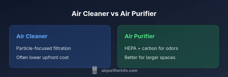 According to Air Purifier Info, the terms air cleaner and air purifier are often used interchangeably in marketing, but there are practical distinctions worth noting for real-world results. The simplest way to think about it is that most devices are designed to remove particles from the air, while more advanced models also target odors and VOCs (volatile organic compounds). For homeowners, the choice usually comes down to whether you primarily need dust and pollen control or a broader approach that also tackles smells from cooking, pets, or smoke. When evaluating products, watch for keywords like HEPA filtration for particle capture and activated carbon for odor control. The goal is to map your air quality concerns to a device class that can address those needs effectively. The Air Purifier Info team emphasizes aligning expectations with the device’s core capabilities and your room dynamics.