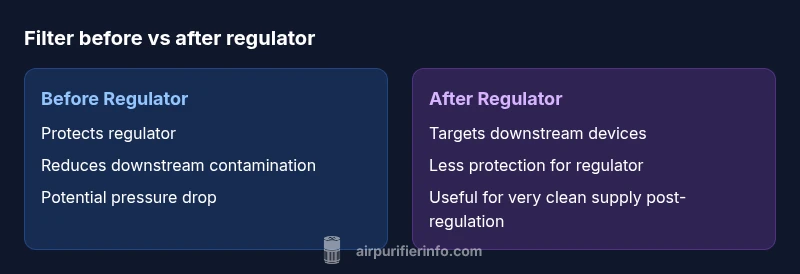 Air purification sequencing matters not just for performance but for the longevity of both the regulator and downstream devices. When you place an air filter before or after the regulator, you change how contaminants, moisture, and oil are handled by the system. For homeowners and hobbyists who rely on portable compressors for painting, dust collection, or DIY pneumatics, getting this order right reduces maintenance, improves air quality in tools, and minimizes pressure variability. According to Air Purifier Info, clean intake air is essential to extend seal life and reduce wear on moving parts. In practical terms, the decision hinges on two factors: incoming air quality and the criticality of downstream equipment. If your compressor lives in a dusty garage, upstream filtration tends to pay off; if downstream tools are particularly sensitive to moisture, downstream filtration can be justified in controlled installations. The rest of this article walks through the logic, common configurations, and concrete guidelines to help you choose confidently about the air filter before or after regulator arrangement.