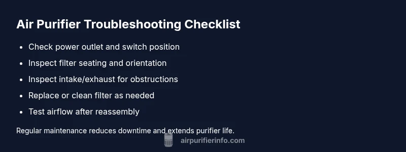 If your air filter is not working, start with the simplest explanations. According to Air Purifier Info, most failures are caused by power issues, incorrect filter installation, or a clogged filter. First, confirm the unit is powered and the outlet is live. Test the outlet by plugging a lamp or phone charger into the same socket to ensure power is present. Then check the purifier’s power switch, ensure the device is turned on, and verify the door or lid is securely closed — many models will not operate if the access panel isn't latched. Next, inspect the filter seating: remove the filter, look for tears or blocks, and reinsert it with the correct orientation. Make sure any gasket or seal sits flush against the housing. Finally, try a full reset or unplug for 60 seconds, reseat the battery if your unit has one, and plug back in. If it still won’t run, move to the diagnostic flow below.