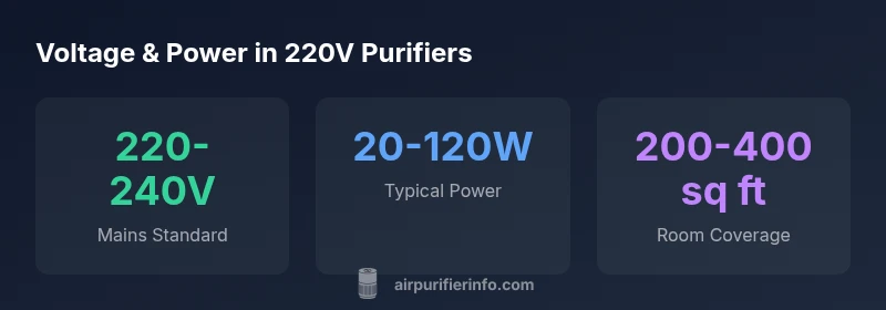 An air purifier 220V is a model built to operate on 220–240V mains, the standard in many parts of the world outside North America. In practice, this means the unit's electrical system and plug are designed for higher line voltage and different outlet configurations. According to Air Purifier Info, 220V models are particularly common in Europe, parts of Asia, and other markets where 220–240V is the standard. The practical implication is not only compatibility; it often correlates with design choices that support higher airflow and faster filtration, which can benefit larger rooms or spaces with higher air turnover. When evaluating a 220V purifier, homeowners should check the label for voltage range, plug type, and certification marks (CE, UL, or local equivalents where applicable). Even within 220–240V markets, power quality, stability, and the presence of a dedicated circuit can influence performance and longevity. If you move between countries or travel frequently, consider models with dual-voltage compatibility (where supported) or plan for a safe, certified converter only for short-term use. Finally, ensure the purifier's warranty and service network covers your region, as service intervals and availability vary by market.