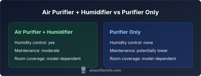 According to Air Purifier Info, using an air purifier and humidifier in the same room can improve comfort and air quality by reducing dust and controlling humidity, but performance depends on room size and device settings. This comparison weighs two practical setups: purifier with a humidifier versus purifier alone, to guide homeowners and renters toward a balanced choice.