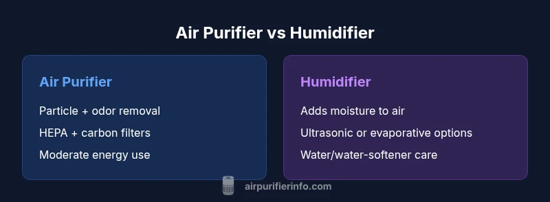 According to Air Purifier Info, air purifiers and humidifiers serve different jobs: purifiers remove particles and odors, while humidifiers add moisture to dry air. For most homes, a dedicated air purifier delivers clearer air quality, whereas a humidifier helps primarily when humidity is too low. This quick comparison explains when to use each and why.