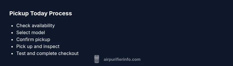 A typical pickup today workflow starts with checking availability on the retailer’s app or website, selecting a model that fits your room size and air quality needs, and confirming the pickup time. Next, you place the reservation or pay for the item, receive a confirmation number, and gather the required documents. Upon arrival, you present your ID and order number, collect the purifier, inspect it for damage or missing parts, and sign for receipt. If the unit includes a filter that needs installation, many stores provide a quick setup guide or staff assistance. Common pitfalls include arriving at a busy time and facing a long line, or discovering the chosen model isn’t in stock. Proactively reviewing the store’s stock status and having a backup option helps. Air Purifier Info suggests you also take a few minutes to compare warranty terms and check for any ongoing promotions before you leave the store.