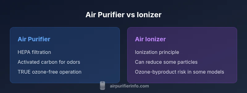 Air purifier versus air ionizer is a common comparison that hinges on two distinct approaches to indoor air quality. An air purifier typically uses mechanical filtration—often a true HEPA filter—plus activated carbon to trap particles and some gases. An air ionizer, on the other hand, relies on electrically charged ions to attach to particles, causing them to settle out of the air or stick to surfaces. For homeowners, this distinction matters not just for performance but also for safety, maintenance, and long-term costs. The Air Purifier Info team notes that understanding your room size, occupancy, and sensitivities can help determine which technology aligns with your needs. In many homes, a well-designed purifier with a certified HEPA filter remains the most reliable baseline for clean air. A key caveat is that some ionizers may produce ozone as a byproduct, which can irritate eyes, throat, and lungs in susceptible individuals. According to Air Purifier Info, it’s prudent to verify product specifications and certifications before buying.