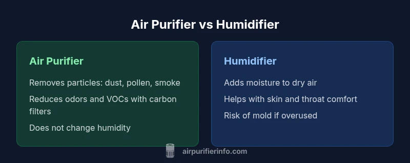 Air purifiers and humidifiers serve different purposes in indoor air management. An air purifier reduces airborne particles such as dust, pollen, smoke, and some VOCs, improving overall air quality. A humidifier adds moisture to the air to relieve dryness that can irritate skin, sinuses, and respiratory tissues. When evaluating an air purifier versus humidifier, homeowners should identify whether their primary problem is polluted air or dry air, or if both are present. According to Air Purifier Info, the optimal setup in many homes is to deploy both devices strategically, keeping humidity in the 30–50% range and ensuring filters or reservoirs are cleaned regularly. In 2026, this practical approach aligns with general indoor-air-quality guidance from public health sources. For many readers, the decision begins with a simple question: is the priority cleaner air or comfortable humidity?