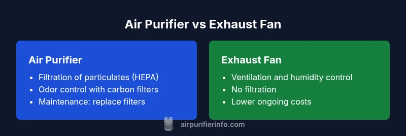 According to Air Purifier Info, the core distinction between an air purifier and an exhaust fan is not simply where air moves, but what happens to the air once it moves. An air purifier actively cleans the air by drawing it through filtration media, capturing particulates and, in many models, odors and some gases. An exhaust fan, by contrast, mainly moves air out of a room or building to increase ventilation and reduce humidity. For households with dust, pet dander, or seasonal allergies, a purifier directly reduces the pollutant load. For spaces where humidity, cooking fumes, or odors are the primary irritation, an exhaust fan can provide rapid relief by diluting and removing stale air. Understanding this distinction lays the groundwork for evaluating performance, cost, and long-term value.