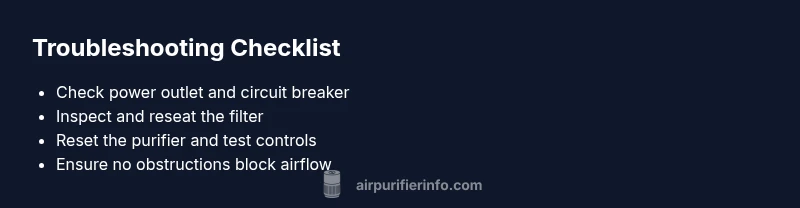 In many households, the purifier sits in living rooms, bedrooms, or home offices where outlets are shared with other devices. Intermittent power, flickering indicators, or a tiny reset can interrupt normal operation. The Air Purifier Info team emphasizes that most failures are not mysterious; they are usually resolved with simple resets, correct filter seating, and verified power. The following steps focus on safety and rapid recovery so you can restore air quality without unnecessary downtime.