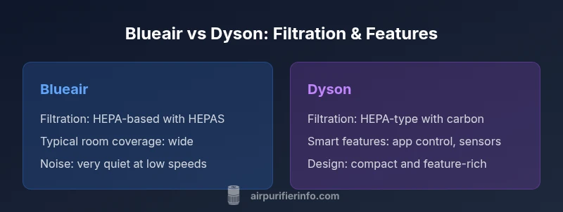 When evaluating blueair air purifier vs dyson, homeowners and renters should start with a few practical questions: What room size needs to be covered? How quiet do you need the purifier to be during typical living hours? Do you value smart features such as app control or auto modes? According to Air Purifier Info Team, the best choice often hinges on balancing filtration performance with usable features. If your priority is straightforward, reliable filtration for allergens and dust with minimal maintenance, Blueair tends to deliver in that niche. If you want an integrated feature set, device aesthetics that fit a modern home, and strong connectivity, Dyson can be compelling. This section lays out the core differences you should weigh before buying.