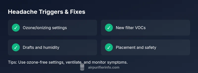 If you’re asking can you get a headache from an air purifier, the short answer is: sometimes. According to Air Purifier Info, headaches are more often reported when ozone-generating or VOC-emitting modes are active, or when new filters off-gas trace compounds. The Air Purifier Info team found that even in well-ventilated rooms, some users experience headaches after prolonged purifier use—especially if the unit runs at high speed or sits directly next to a seating area. This is not a universal experience, but recognizing triggers helps you adapt. In the sections that follow, you’ll learn the most common culprits, how to identify them in your environment, and concrete steps to minimize risk without sacrificing air quality. Remember: headaches can have many causes, but understanding triggers helps you tailor settings, select safer models, and compare features like CADR, ACH, and filter type. The goal is safer purification that supports comfort, breathing, and overall wellbeing in 2026.