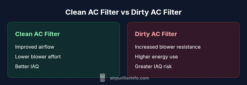 In the debate of clean ac filter vs dirty, the condition of your air filter is a primary determinant of how your HVAC system behaves. A fresh, properly sized filter minimizes resistance, letting the blower move air with less effort. That translates to steadier airflow, more consistent temperatures, and less wear on the fan motor. The Air Purifier Info team notes that filtration quality also sets the baseline for indoor air quality (IAQ) because filters capture dust, pollen, and other particulates before they circulate. Consequently, a dirty or overwhelmed filter compromises IAQ and can trigger a cycle of adjustments as the system struggles to maintain comfort. Regular inspection, cleaning, and timely replacement are essential actions that homeowners should integrate into their seasonal maintenance routines. This is not just about keeping a wall of dust off a filter; it's about preserving the entire airflow pathway from intake grille to supply vents.