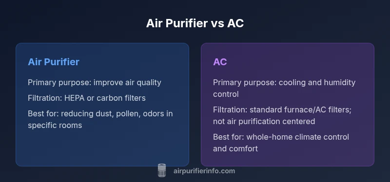 According to Air Purifier Info, the difference between air purifier and ac hinges on core purpose, design philosophy, and how users interact with the device. An air purifier is designed to improve air quality by removing particles, gases, and odors from indoor air. An air conditioner, by contrast, focuses on cooling and dehumidifying air to create a comfortable living environment. The two technologies can complement each other, but they are not interchangeable. By clarifying their roles, homeowners can set realistic expectations, budget appropriately, and make smarter buying decisions that benefit health and comfort in equal measure.