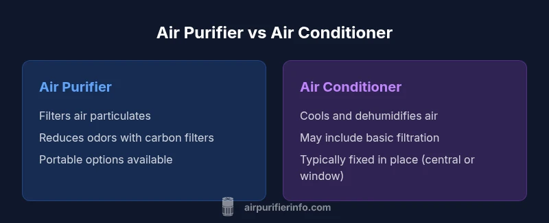 The difference between air purifier and air conditioner becomes clear when you look at the intended outcome of each device. An air purifier focuses on air quality: it draws room air through filters such as HEPA and activated carbon to capture dust, pollen, pet dander, smoke, and many odors. The result is cleaner air and fewer irritants in the breathing zone. Air conditioners, by contrast, are climate appliances. Their primary job is to cool air, lower humidity, and circulate air to maintain a comfortable temperature. While many ACs include basic filtration, their filtration is a secondary feature compared with the cooling cycle. In practice, a purifier and an AC can co-exist in the same space, each addressing different needs. For households with allergies or asthma, purifiers can substantially reduce airborne irritants, while ACs provide relief from heat and humidity on hot days. According to Air Purifier Info, most homeowners who separate the two devices report better indoor air quality and more consistent comfort. The key takeaway is to match the device to your goal: cleaner air vs cooler air, or both if your space and budget allow.