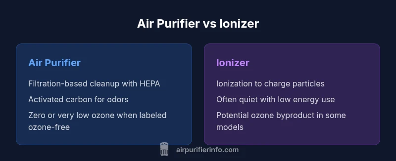 Air purifiers physically filter air using media like HEPA and carbon, while ionizers charge particles so they settle or collect on surfaces. Purifiers tend to be more reliable for overall cleaning, whereas ionizers can risk ozone production if not labeled ozone-free.