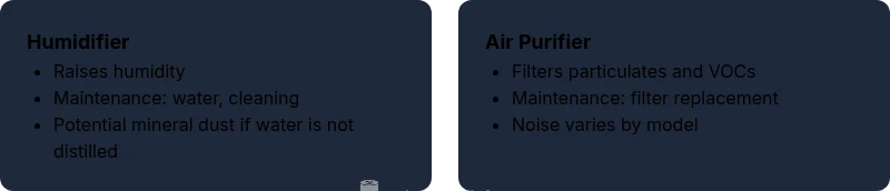 - Safety: Humidifiers require cleaning and distilled water; purifiers demand regular filter changes and proper sizing to avoid air bypass.