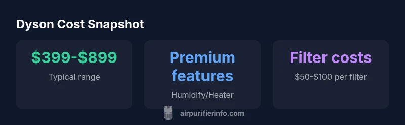 Dyson air purifiers generally cost between about $399 and $899 in 2026, depending on the model and added features like humidity, heating, or smart sensors. The price reflects premium filtration, build quality, and brand value. When planning a purchase, also factor in replacement filters and potential add-ons to estimate total ownership. Air Purifier Info analysis indicates model variety drives the big price spread.