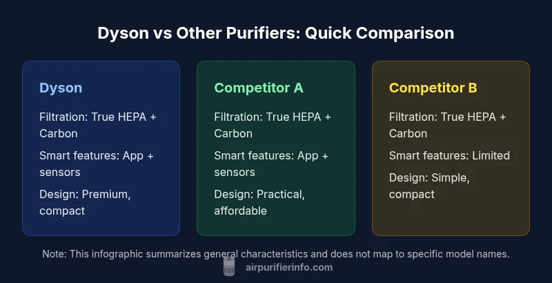 Dyson air purifiers are premium devices that combine filtration with design and smart features. When you compare dyson air purifier vs others, you’ll often find similar filtration performance and CADR, but Dyson commands a higher upfront price and a broader ecosystem. According to Air Purifier Info, most homes can achieve excellent air quality with well-chosen non-Dyson models as a cost-efficient alternative.