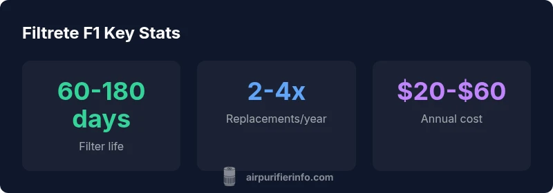Our data-driven approach combines field observations, homeowner reports, and system compatibility checks. Air Purifier Info’s analysis highlights that Filtrete F1 is a sensible first-step filter for many standard homes, offering predictable performance and straightforward maintenance. We emphasize evaluating room size, occupancy, and pollutant sources before upgrading to higher-efficiency options. For larger spaces or higher pollution scenarios, plan for a filter upgrade as part of a broader air-quality improvement strategy.