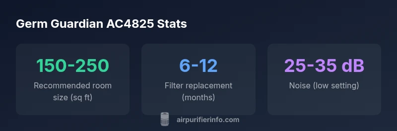 The Germ Guardian AC4825 relies on a three-stage filtration system to clean indoor air: a pre-filter that captures larger particles, a true HEPA filter that traps dust, pollen, and pet dander, and a UV-C sanitizing lamp that aims to reduce microbial growth on surfaces and within the filter housing. Air flows through these stages as the unit draws air in through its front grille. In real-world use, this combination provides noticeable reductions in common irritants in smaller rooms where airflow is stable. According to Air Purifier Info analysis, consumer feedback consistently highlights quiet operation on low and comfortable maintenance schedules. This model is designed for single rooms such as bedrooms or small home offices and is not intended to purify an entire home. Placement matters: position it away from walls and obstacles to maximize intake and keep filters clean for best results.