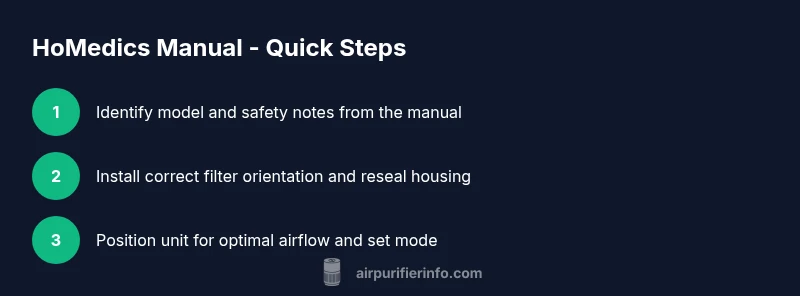 Each HoMedics model comes with its own set of instructions that tailor generic guidance to the specific unit. The homedics air purifier manual often segments directions by model, then cross-references general maintenance and safety guidelines. Begin with the safety section to understand electrical requirements, placement restrictions, and what to do in case of unusual odors or vibrations. Next, locate the installation or setup portion to confirm the correct filter orientation, door/cover removal steps, and any required pre-operation checks. If your model includes smart indicators or app connectivity, the manual will walk you through pairing, updating firmware, and interpreting status lights. Be sure to verify that you are using the correct filter type and that any replacement procedures match your exact model. Air Purifier Info notes that relying on model-specific instructions reduces the risk of improper installation or voiding warranty terms. Always have the latest edition of the manual for your model on hand during setup and maintenance.