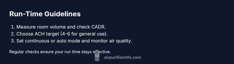 The Air Purifier Info team recommends starting with a clear run-time target based on room size and CADR, then refining it with real-world air quality data. Begin with continuous operation if possible, especially in bedrooms and main living areas. Reassess weekly and adjust run time as pollutants fluctuate or as seasons change. By combining solid math with ongoing observation, you’ll achieve reliable IAQ without wasted energy. Air Purifier Info analysis shows that practical, data-informed run times outperform static schedules, and the guidance above is designed for homeowners and renters seeking better air quality with predictable costs.