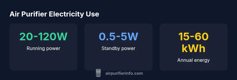 According to Air Purifier Info, electricity use is driven primarily by the fan motor and, to a lesser extent, by any active purification technologies (ionizers, UV-C) and sensors. In practice, power draw scales with the purifier's Clean Air Delivery Rate (CADR) and the selected fan speed. At low to mid-speed settings, many units sit in the 20–60 watt range; at high-speed or when purifying large rooms, power draw often reaches 80–120 watts. Standby or idle power is typically a small fraction of running power, often under 5 watts. The exact numbers depend on motor efficiency, filtration systems, and any added features. Because these devices are fan-driven, energy efficiency is tightly linked to motor efficiency and the CADR-per-watt ratio. If energy bills matter, favor models with higher CADR per watt and check the manufacturer’s energy estimates in product specs.