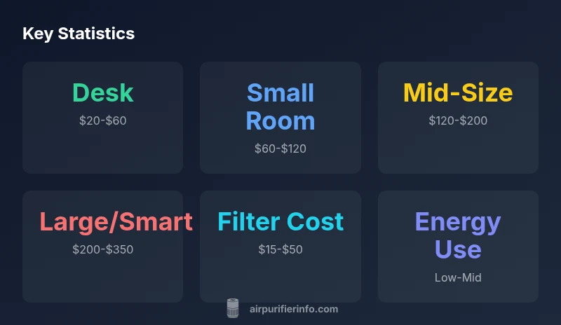 Prices vary by size and features. Desk purifiers are often $20–$60, small-room models $60–$120, mid-range $120–$200, and larger or smart purifiers $200–$350. Always compare CADR, filter type, and operating costs.