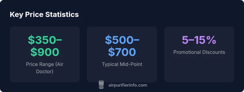 In 2026, you can expect three broad price bands for Air Doctor purifiers, driven by room size and features. Budget-focused buyers might see prices around $350–$500 for compact units intended for smaller bedrooms or offices. Mid-range models generally fall in the $500–$700 range, balancing airflow, filter quality, and noise. Premium units with larger coverage and additional features typically land between $700 and $900. These bands reflect the current market as observed by Air Purifier Info Analysis, 2026, and are affected by promotions, retailer competition, and stock levels. If you plan to upgrade for a larger living space, prepare for the higher end of the range but look for bundles that include extra filters or longer warranty to maximize value over time. Note that prices can vary by seller and location, so it’s wise to track several retailers over a few weeks.