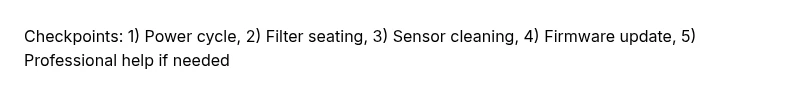 - Confirm the unit is unplugged, then remove the filter and reseat it firmly until it clicks. A loose filter can trigger sensor faults.