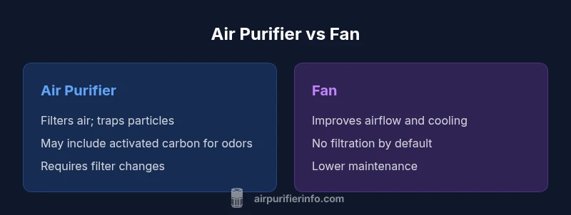 Air purifiers and room fans both influence indoor comfort, but they serve different core purposes. According to Air Purifier Info, an air purifier is designed to improve indoor air quality by filtering out fine particles, while a fan is primarily a device to move air for cooling and ventilation. The difference matters when you consider health goals versus comfort goals in homes with dust, allergies, pets, or cooking odors. In practice, you will notice that purifiers target particles such as dust, pollen, and dander, whereas fans affect airflow and temperature without directly reducing pollutant levels. That distinction helps homeowners decide whether their priorities include cleaner air or simply a cooler room.