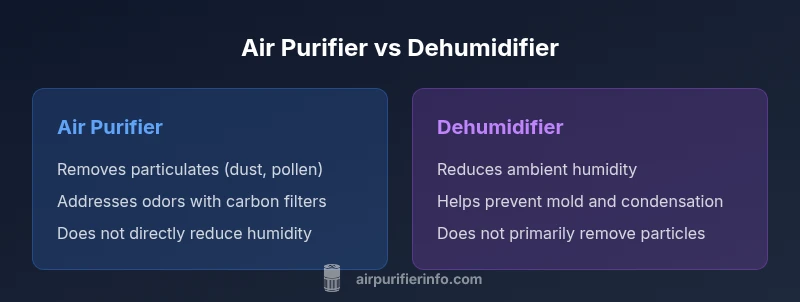 Air purifiers and dehumidifiers serve different purposes and are not the same device. An air purifier cleans particles from the air, while a dehumidifier lowers humidity. If your goal is dust and allergy relief, a purifier helps; if you struggle with damp, a dehumidifier is essential. In some cases, a combined unit may help.