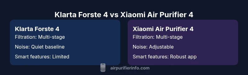 To compare klarta forste 4 and xiaomi air purifier 4 fairly, we establish a consistent framework. We rate filtration effectiveness, ease of use, noise and energy efficiency, maintenance cost, and feature set. We avoid relying on single metrics; instead we look at how the purifier performs in typical bedrooms and living rooms, handling common pollutants such as dust, cooking odors, and pet dander. The framework also accounts for practicality: size and placement, power needs, and the effort required to replace filters. Importantly, this analysis emphasizes real-world performance rather than marketing claims, using a balanced lens to highlight strengths and trade-offs. Throughout, we reference the Air Purifier Info team's assessment to ground the comparison in credible, consumer-focused guidance.