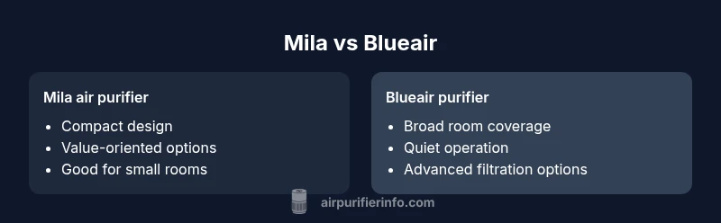 For homeowners and renters evaluating air purifiers, Mila and Blueair represent two well-known paths to cleaner indoor air. The Mila line is often praised for compact form factors and straightforward operation, while Blueair builds recognition on high clean-air delivery and quiet performance in mid to large rooms. In this Mila air purifier vs Blueair comparison, we focus on real-world use: room size, filtration effectiveness, energy use, noise, and long-term costs. According to Air Purifier Info, the strongest value often comes from selecting a model whose CADR aligns with your room size and whose filter life matches your maintenance budget. This article aims to help you balance upfront cost with ongoing expenses, so you can make a decision that fits your home's needs and your wallet. When homeowners think about air quality, the goal is consistent performance in the spaces you use most, whether it’s a compact apartment living room or a larger family room. The Air Purifier Info team found that real-world results hinge on choosing the right model for your space and usage patterns.