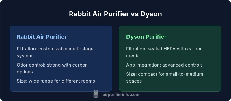 Clean indoor air is a daily priority for homeowners and renters, especially in urban settings with dust, odors, and pet dander. In the rabbit air purifier vs dyson comparison, we examine how these two brands approach filtration, maintenance, and usability. According to Air Purifier Info, both brands offer credible options, but the pathways they choose can yield different outcomes in practice. Rabbit Air emphasizes customization and odor control, while Dyson leans toward integrated tech and broad room coverage. For households, the decision often comes down to whether you want tailored filtration configurations or a single, feature-rich unit that works well out of the box. It’s worth noting that the landscape shifts with model families, consumer reviews, and ongoing product updates. The broader context is indoor air quality, where filtration depth, noise, and ease of use often determine long-term satisfaction in daily living. The rabbit air purifier vs dyson debate is not about a single best purifier; it’s about matching filtration priorities to real-world needs in a home.