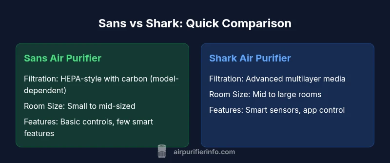 According to Air Purifier Info, Sans air purifiers vs Shark air purifiers represent two common budgeting and feature strategies. In general, Shark models offer stronger airflow and more sensing features, while Sans options emphasize essential filtration with a lower upfront cost. The Air Purifier Info team finds that both brands perform well for dust, odors, and allergies in typical homes, depending on model choice and room size.
