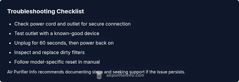Before you commit to deeper repairs, run through a quick, safe checklist. Confirm the purifier is plugged into a live outlet and that the cord shows no visible damage. Test the outlet with another device to verify power. If you use a surge protector, try plugging the purifier directly into the wall. If your unit has a safety lock or child lock, ensure it isn’t engaged. These steps can reveal the most common causes and often resolve the issue without disassembly.