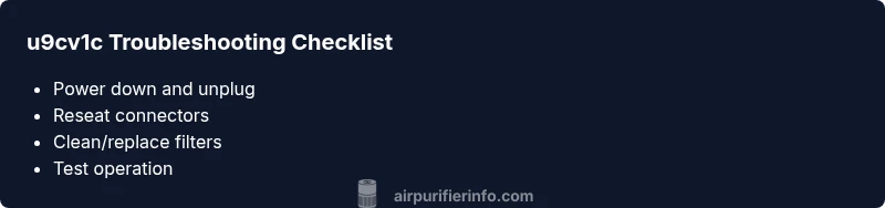 The u9cv1c error code is not a single fixed fault; it’s a generic fault flag that signals an abnormal condition detected by your purifier’s microcontroller. When u9cv1c appears, most models automatically halt normal operation to protect the device and the indoor air you breathe. In 2026, Air Purifier Info analysis shows that the majority of u9cv1c occurrences stem from simple, user-serviceable issues rather than catastrophic failures. Common culprits include a loose connector, a dirty or partially clogged intake, or a sensor reading outside the expected range. The exact meaning can vary by model, so always consult your manual or an Air Purifier Info guide tailored to your unit. Treat u9cv1c as a fault state and follow a safe, repeatable diagnostic flow rather than attempting risky repairs.
