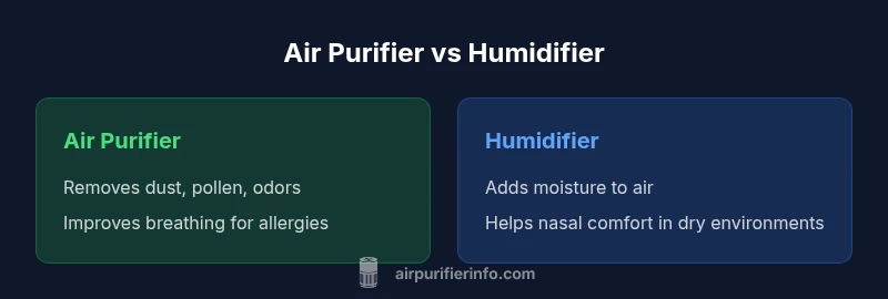 In modern homes, the decision between an air purifier and a humidifier centers on what you want to improve: air quality or comfort from humidity. The Air Purifier Info team notes that a purifier targets particles like dust and pollen, as well as odors, while a humidifier raises moisture levels to ease dry air symptoms. Understanding these roles helps prevent mismatches between expectations and results. When people ask what is better air purifier or humidifier, they are usually trying to balance two competing priorities: cleaner air and comfortable humidity. Air Purifier Info emphasizes that the choice should start with the primary problem you are trying to solve and then consider secondary needs. This approach reduces wasted spend and helps you measure outcomes with clear expectations.