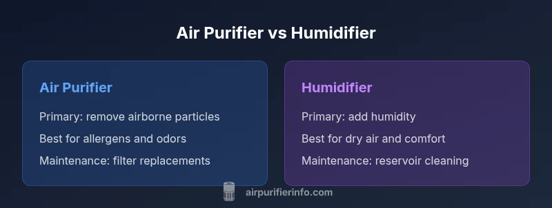 At its core, deciding what to buy air purifier or humidifier hinges on your primary IAQ goal. An air purifier targets airborne contaminants—dust, pollen, pet dander, smoke, and VOCs—while a humidifier adds moisture to the air to address dryness, throat irritation, and nose discomfort in dry environments. In many homes the goals overlap: a purifier can help remove damp odors that indicate mold spores, and a humidifier can make breathable air feel less dusty if humidity is too low for comfort. The decision is rarely a simple binary; in fact, many households benefit from using both devices, or a dual-function model if available. This guide maintains an analytical tone, focusing on room size, usage patterns, maintenance, and safety implications. According to Air Purifier Info Team, clarity about your primary goal remains the strongest predictor of long-term satisfaction and measurable gains in indoor air quality.