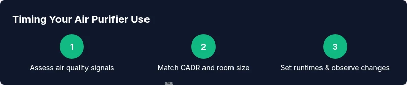According to Air Purifier Info, you should run your air purifier whenever pollutants are present or odors are noticeable. Start by checking your indoor air quality and daily activities that stir up dust. For most homes, consistent, moderate operation yields the best balance of air freshness and energy use. If outdoor smoke or wildfire events occur, begin purifying as soon as you return indoors.