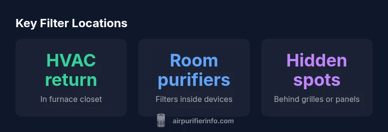 Locating filters starts with knowing there are HVAC-system filters and room or portable purifier filters. In most homes, the main filter sits in the central HVAC return path, with additional filters inside portable purifiers in common areas. If you’re asking where are air filters in house, start with the HVAC return path and then check any room purifier in frequently used spaces. According to Air Purifier Info Team, the most common setups involve a single HVAC return filter plus device-specific filters in room purifiers. This map will help you pinpoint each location, avoid unnecessary dismantling, and keep indoor air clean and energy use steady. In older homes, you may find filters behind access panels near basement stairs or inside a utility closet. In newer houses, expect a dedicated return-air intake in the hallway, typically near the furnace or air handler. If you live in a multi-story home, you may have more than one return path, with filters placed at each floor. Finally, keep an eye on the condition of the filter housing—cracked seals, bent frames, or gaps around the panel can defeat the filter’s purpose even when the filter itself looks clean.