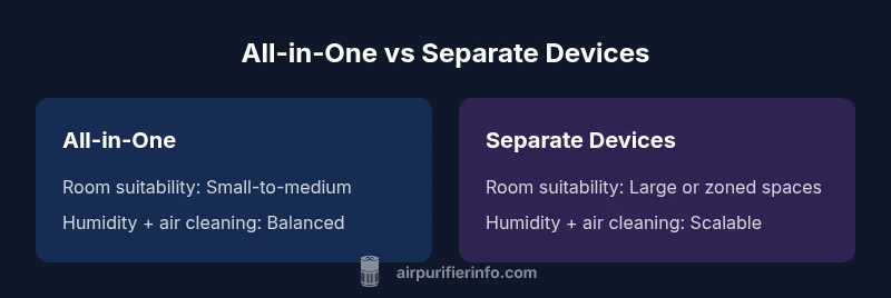 All-in-one purifier-dehumidifier units combine two functions into a single cabinet, which saves floor space and simplifies control schemes. They tend to be ideal for compact rooms, apartments, or spaces where wiring and outlets are limited. Air Purifier Info, and its team, notes that these units can be a practical choice when you want a minimal setup and predictable maintenance. However, the trade-off is that a single unit may not deliver peak air-cleaning and humidity-removal performance for larger areas or spaces with stubborn humidity. In practice, homeowners weigh convenience against raw performance, and Air Purifier Info’s analysis highlights the nuanced value of both paths depending on room size and climate. Remember to consider filter upkeep, energy use, and noise when comparing models as you narrow down options.