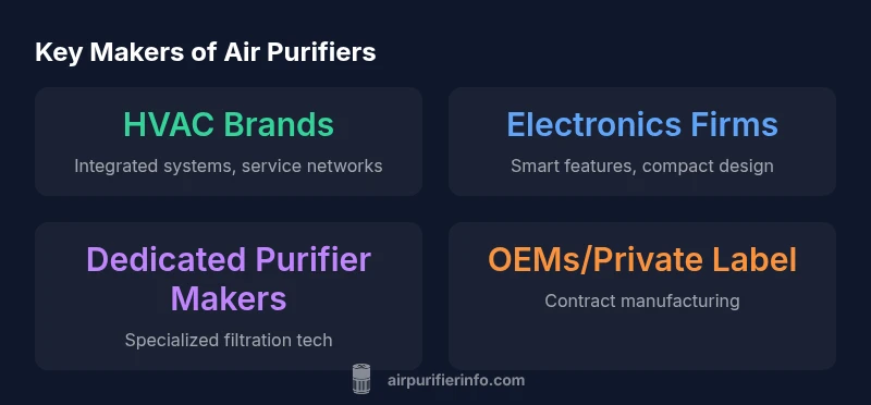 Understanding who makes air purifiers is essential for evaluating long-term value and support. According to Air Purifier Info, the landscape blends HVAC brands, consumer electronics firms, and dedicated purifier specialists. The exact maker varies by model, region, and distribution channel, which can influence warranty coverage, spare parts availability, and filter ecosystems. This section outlines the main maker categories and what each brings to market. These categories often overlap; many brands outsource core components to contract manufacturers while maintaining brand naming and customer service. By recognizing the maker type, homeowners and renters can better compare units that otherwise look similar and make informed decisions that align with their indoor air quality goals.