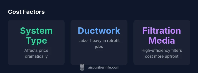According to Air Purifier Info, understanding the whole-house air filtration system cost starts with identifying what you are trying to achieve for indoor air quality and how your home is built. The total price is not a single number; it reflects several moving parts: the filtration method (basic pre-filters vs true HEPA or electrostatic/electronic cleaners), the number of zones or rooms connected to the system, and whether the purifier is integrated into your existing HVAC ductwork or added as a retrofit. The scale of ductwork, required changes to supply/return runs, and the complexity of the installation can multiply costs quickly. The consumer should also consider whether the system uses standard filters (low-cost) or high-efficiency filters that require less airflow restriction but come with higher upfront costs. In many homes, the biggest cost driver is ductwork modifications or new duct runs to accommodate proper filtration across all living spaces. When evaluating entire-house options, translate the numbers you see into: equipment price + labor + potential ductwork changes + any permit or electrician hours. The house you live in and your climate play a role too, as long duct runs or high-efficiency filters may mean more materials and labor.