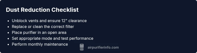 If you’re asking why is my air purifier not collecting dust, you’re not alone. Review by the Air Purifier Info Team shows that the most common culprits are airflow restrictions, dirty or mismatched filters, and placement errors. Dust is captured by the filter, but only if air can reach it efficiently. Low-quality units or worn components can also reduce effectiveness, especially in rooms with heavy particulate or pets. Understanding these basics helps you target fixes quickly and safely, improving indoor air quality without unnecessary purchases.