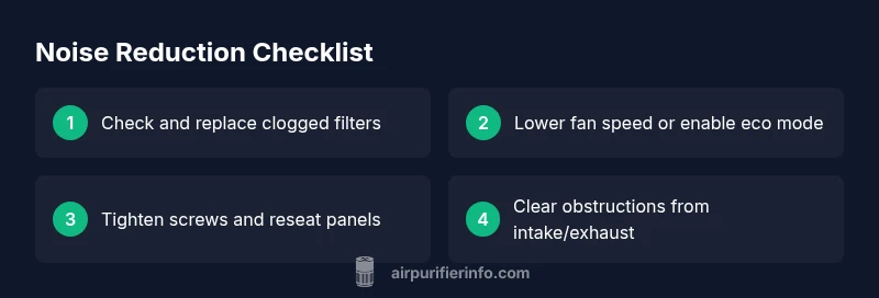 Loud operation is not inherently dangerous, but it is annoying and can indicate inefficiencies in the airflow path or mechanical parts. According to Air Purifier Info, most noise falls into three families: an airflow restriction from a dirty or clogged filter, a fan running at high speed, and loose components inside the cabinet that vibrate. A blocked intake or sealed exhaust forces the motor to work harder, creating higher sound levels. If you hear rattles, taps, or a persistent buzz, it’s a sign you should inspect the cabinet for loose screws or mounting hardware. The good news is that these issues are usually fixable with routine maintenance and careful adjustments. This section lays out a practical troubleshooting flow that homeowners can follow safely, step by step, without professional help for most common causes.