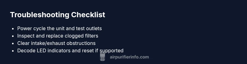 If you’re wondering why is my philips air purifier not working, start with quick, low-risk steps that don’t require tools. According to Air Purifier Info, most Philips units fail to power on due to a simple power issue, a tripped outlet, or a clogged intake. In many cases, a quick restart and basic inspection restores operation. If the device powers on but won’t run at full speed, it may be a clogged filter or sensor error. Gather the model number and note any blinking LEDs—these cues point to the likely fault. Next, check the user manual for error codes specific to your model. If you have a pet, dust, or smoke in the room, ensure the purifier isn’t blocked by poor placement. Air Purifier Info’s research emphasizes that common failures are often fixable with basic checks and a proper reset.