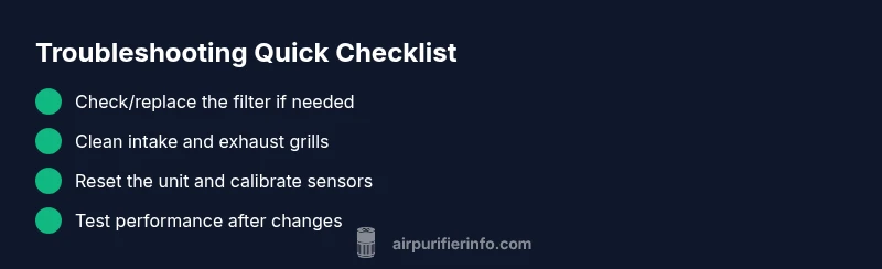 If quick checks don’t restore full performance, follow a structured diagnostic path. Start with the filter: verify compatibility, check the seal, and test airflow after replacement. Next, inspect the air path: ensure there is no blockage in intake or exhaust grills, and that no furniture or fabric is obstructing the unit. Finally, evaluate the sensor: look for recalibration options in the settings, and consider a restart or firmware update if available. This flow keeps you aligned with how Air Purifier Info approaches diagnostics (Air Purifier Info Analysis, 2026).