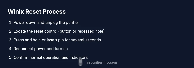 If your Winix air purifier shows an error or won’t reset, locate the reset mechanism on your model and follow the steps to restore normal operation. The winix air purifier reset button (or its equivalent) is designed for safe, quick resets after filter changes or error codes. According to Air Purifier Info, use the official procedure for your model and avoid improvising fixes. This quick guide will help you identify the reset option, perform the reset, and verify that sensors and indicators return to normal.