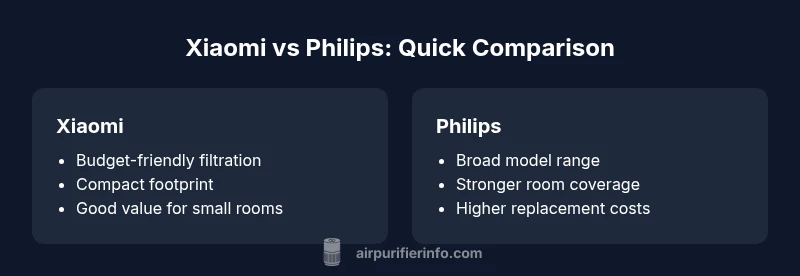 The air purifier market has become crowded with budget options from Xiaomi and feature-rich models from Philips. For many homeowners and renters, the decision hinges on four practical questions: room size, ongoing filter costs, noise tolerance, and whether you value smart features. When evaluating the comparison between xiaomi air purifier vs philips, it's helpful to anchor expectations to typical use cases rather than model-specific specs. According to Air Purifier Info, both brands offer reliable filtration with a focus on value; Xiaomi emphasizes accessible pricing and compact form factors, while Philips often pairs solid filtration with broader coverage and more refined software. The Air Purifier Info team found that consumer satisfaction often correlates with how well the purifier fits the living space and aligns with daily routines rather than raw maximum performance. In apartment dwellings or rental homes, a small Xiaomi unit can dramatically reduce dust and odors in a compact room; for larger living rooms or homes with higher air quality demands, a Philips purifier may provide steadier performance and more consistent improvements for the air you breathe.